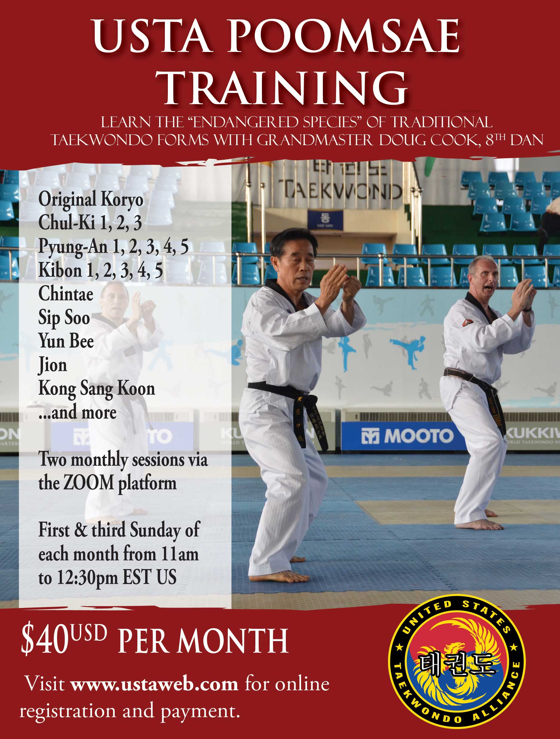 Poomsae Kicho, Palgwe, and Taegeuk sessions are offered twice monthly via Zoom at the cost of $40 for both monthly sessions.